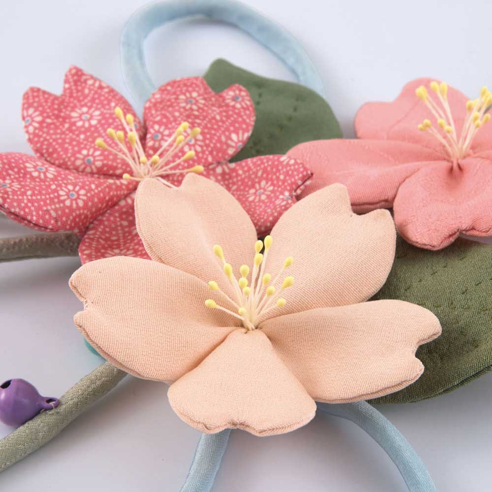 【古裂・キット作り方つき】まるで桜が咲いたような、立体的な作りのつるし飾りです。ベースのひもに縫いつけて仕上げます。5弁の花びらを合わせ、花芯にはペップを使用します。
