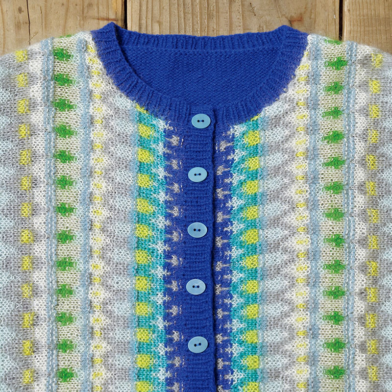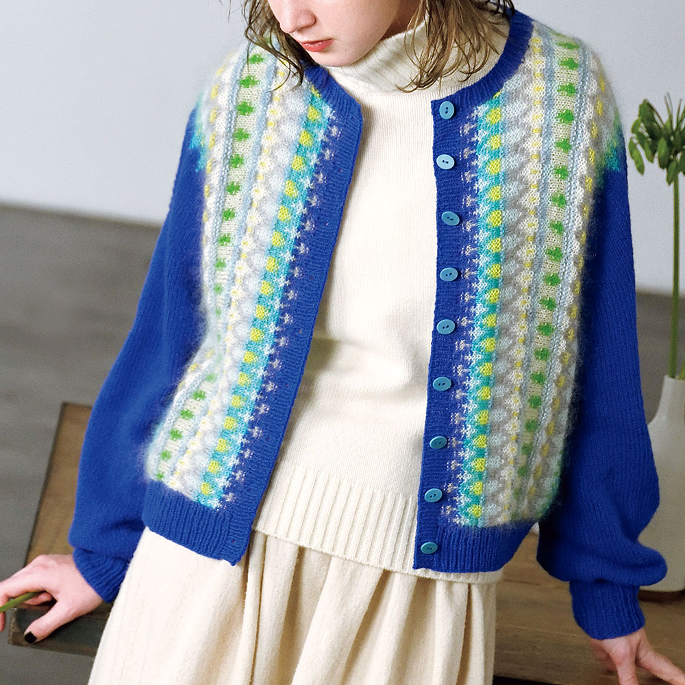 スウェーデンのボーヒュース風の編み込み模様を横編みにしてパネル状に配しました。輪郭を柔らかくなじませる起毛糸と裏目のニュアンスが新鮮な表情を見せてくれます。鮮やかなブルーにふっくらとした袖が今の気分。