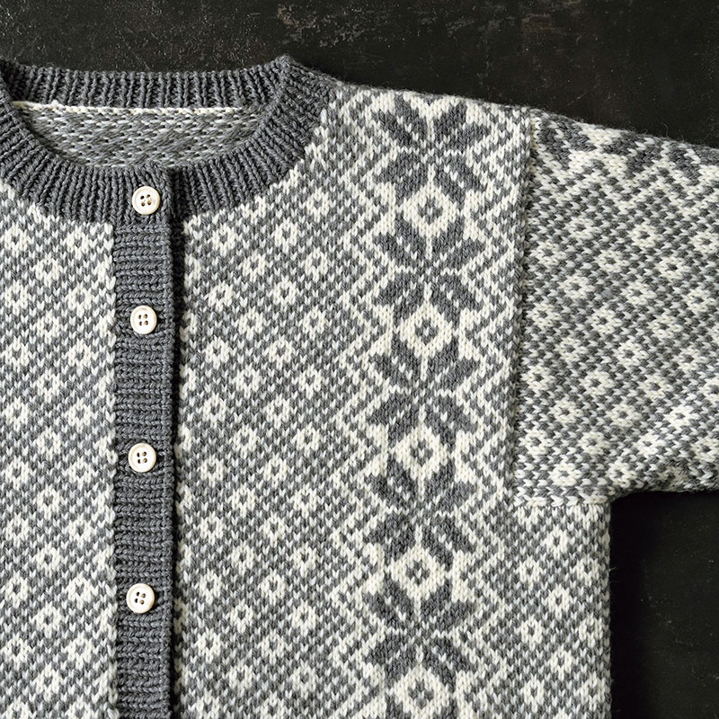材料:オリムパス ツリーハウス パラス グレー(417)285g/8 玉、生なり(401)210g/6 玉。直径14mmのボタン7 個。