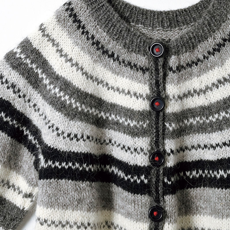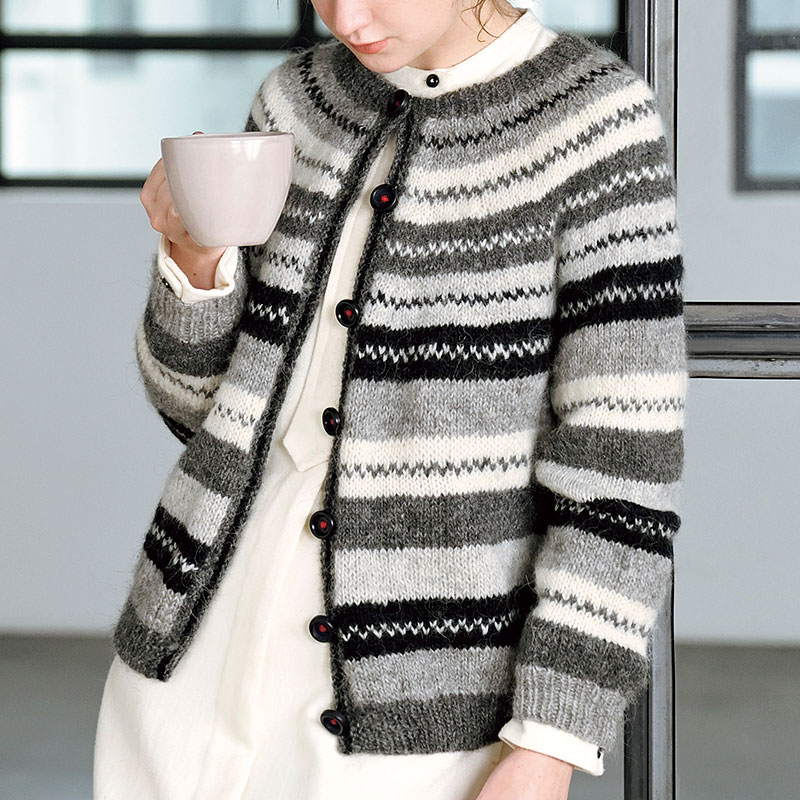 材料:内藤商事 レットロピー 濃いグレー(0058)130g/3 玉、グレー(0056)95g/2 玉、生なり(0051)・薄グレー(0054)・黒(0059)各70g/各2 玉。直径24mm のボタン7 個。