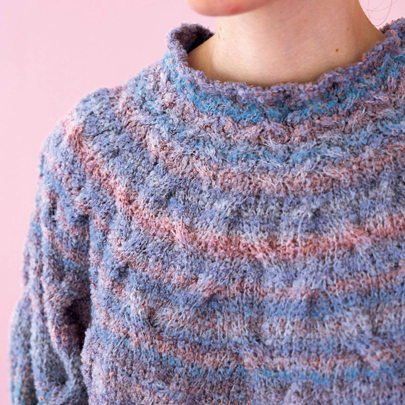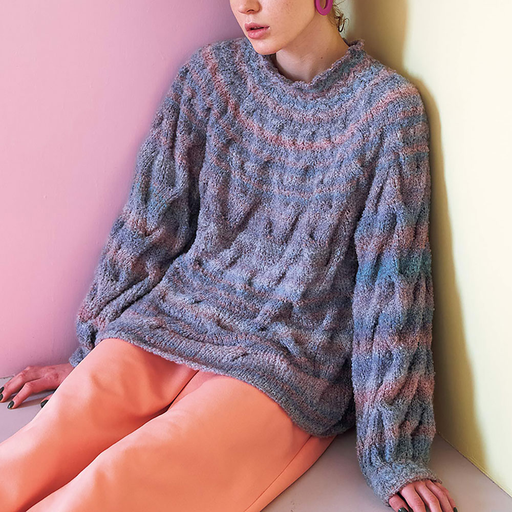 ふわもこ糸で編んだケーブル模様の丸ヨーク。段染め糸で編むと、身頃とヨークでのグラデーションの違いが楽しめます。身頃も袖も増減なしでぐるぐると輪に編み進むので、とじはぎなしで完成します。
