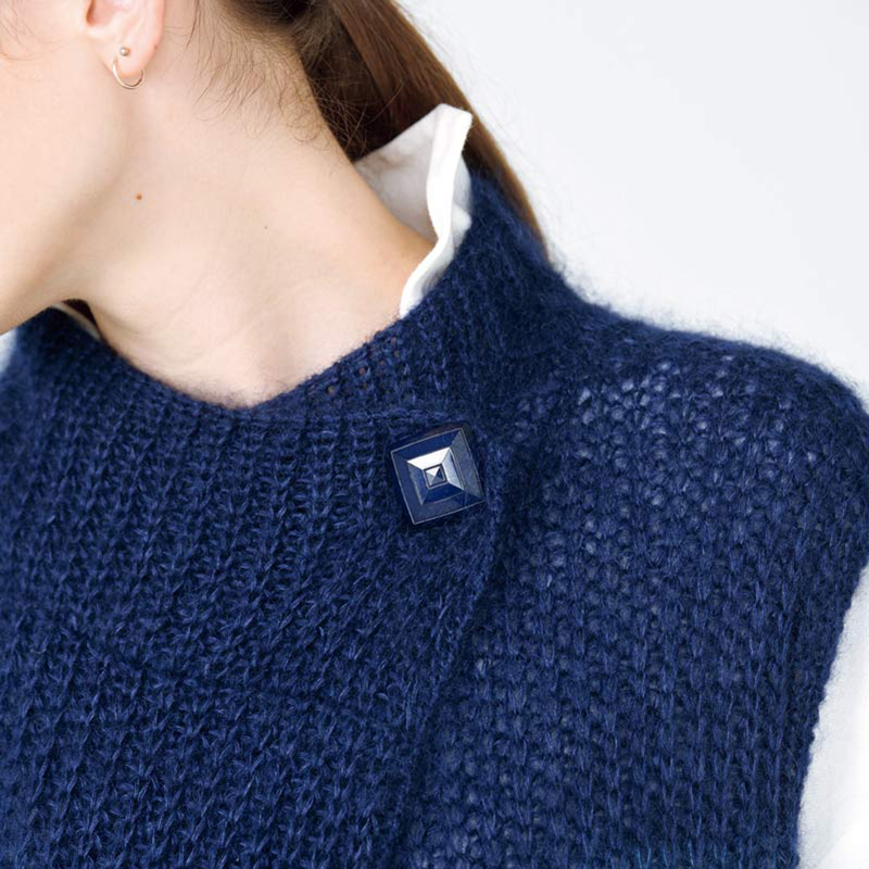 材料:ておりや シルクモヘヤ レイナ 青(11)150g/8 玉、紺(10)100g/5 玉。30mm×30mm のボタン1個、直径15mm のボタン2 個。