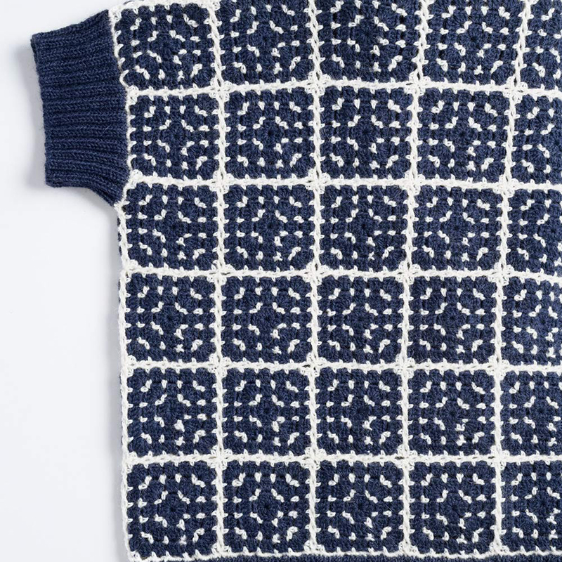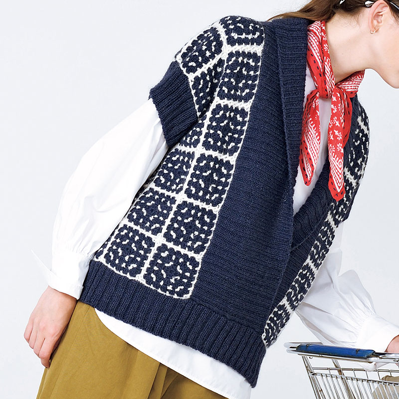 紺と白のコントラストが、どこか和テイストで懐かしい雰囲気。配色したモチーフがこぎん刺しのようにも見える趣のあるベストです。打ち合わせは重ねてとめるスタイルなので、スポンとかぶれて、脱ぎ着も楽々です。