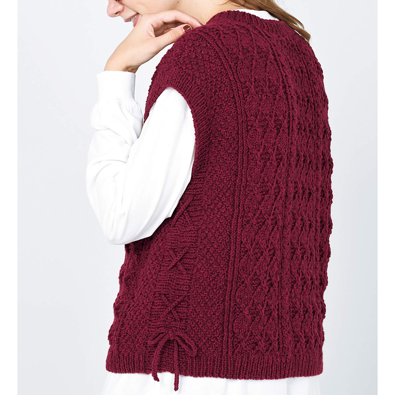 アラン模様のベストは、今季流行りのシルエット。脇の部分は、共糸で編んだ飾りひもを通して結んでいます。ふんわりふくらんだバルーンスリーブシャツにもよく合うけれど、年令を問わずに着られるのが嬉しい。今どきファッションのおともにぜひ。