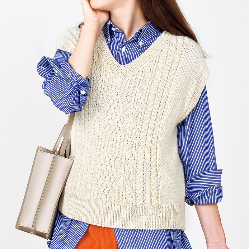 正統派のVネックベストは、この季節、絶対編みたいアラン模様で決まり! ボリュームを抑えたねじり目のラインが素敵なデザインです。両脇はメリヤス編みにしているので、サイズの調節も自由自在。自分のために、誰かのために、ベストなベストを編みましょう。