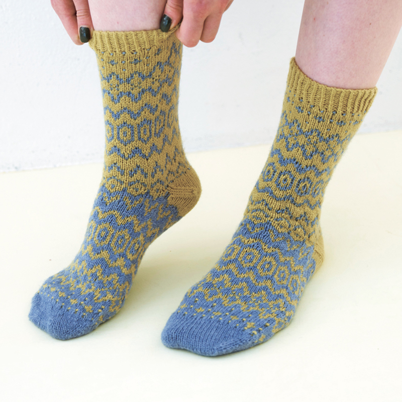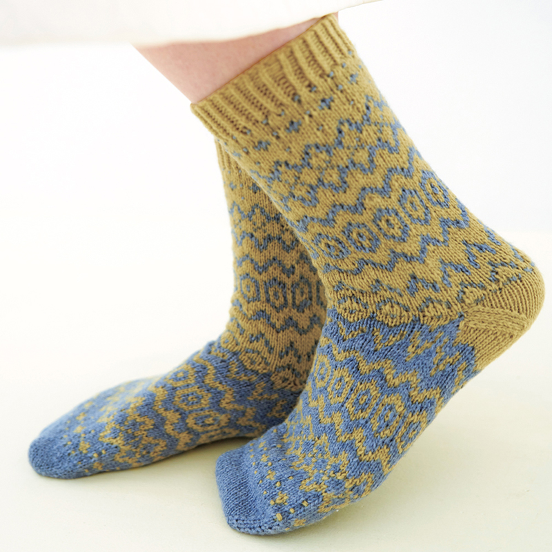 材料:Keito ホットレイ ソックヤーン ブルー40g/1玉、イエロー35g/1玉。