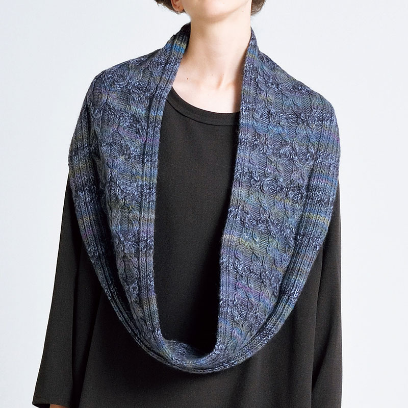 同じ模様を使って編んだ、バリエーションいろいろ。1玉で編めるスヌードは、ストンとかぶるだけで暖かく、マフラーのように端が邪魔にならないから、おうち時間を快適に過ごすパートナーとしても優秀です。2玉バージョンはそのままかぶってストールのように使ってもよし、ぐるりと二重に巻けばボリューム満点の極暖スヌードとしても使えます。3玉バージョンは、目先を変えてフードつきのスヌードに。1玉& 2玉バージョンよりゴム編み部分を増やし、模様はそのまま、編み幅を広げています。フードはかぶらなくても、おしゃれのアクセントになって可愛い。