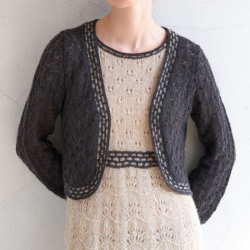 シックでエレガントな配色のボレロ&ワンピースのセットは、棒針編みで。棒針編みならではの透け感が素敵です。ボレロ、身頃、スカートとそれぞれに違う模様を共通の縞模様がまとめ上げる、絶妙なハーモニーを楽しみましょう。※こちらはボレロ単品のレシピです。