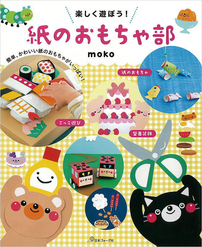 紙で作る簡単で楽しいおもちゃがいっぱい! おいしそうな食べ物がずらりと並ぶ「ごっこ遊び」。「壁面装飾」は、季節のモチーフに加え、お誕生日のモチーフも。「紙のおもちゃ」は、輪投げ、魚釣り、紙のクレヨンetc……。遊ぶの大好きなみんなの入部をお待ちしています! 実物大型紙つき。