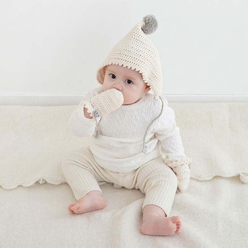 生成りにグレーを合わせた上品な配色とシンプルな編み地が、赤ちゃんのかわいらしさをより一層引き立てます。