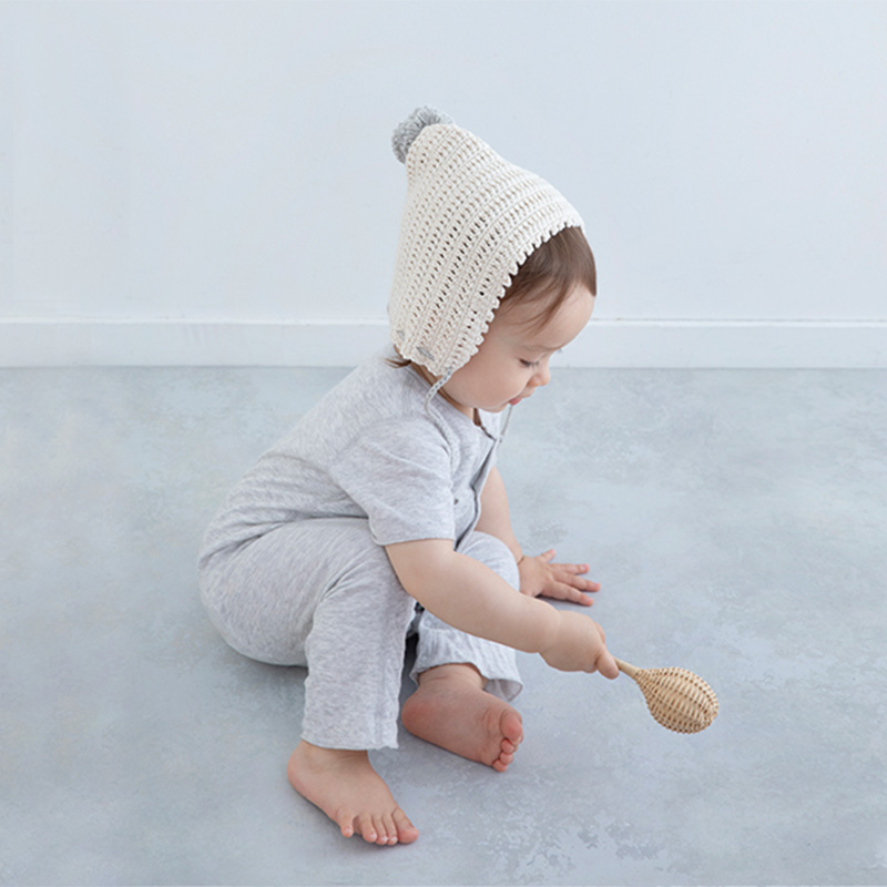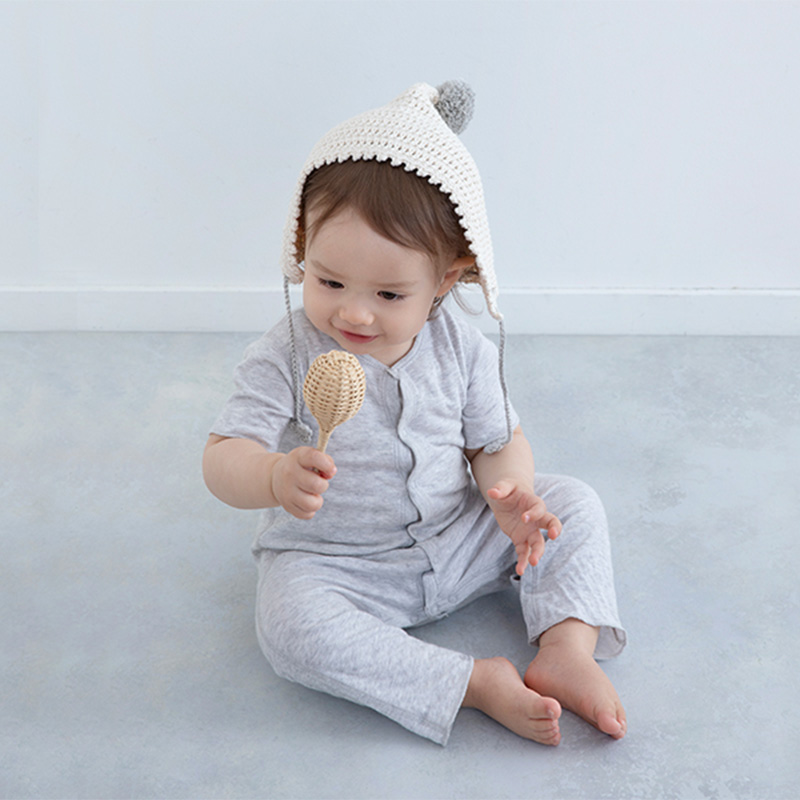 生成りにグレーを合わせた上品な配色とシンプルな編み地が、赤ちゃんのかわいらしさをより一層引き立てます。
