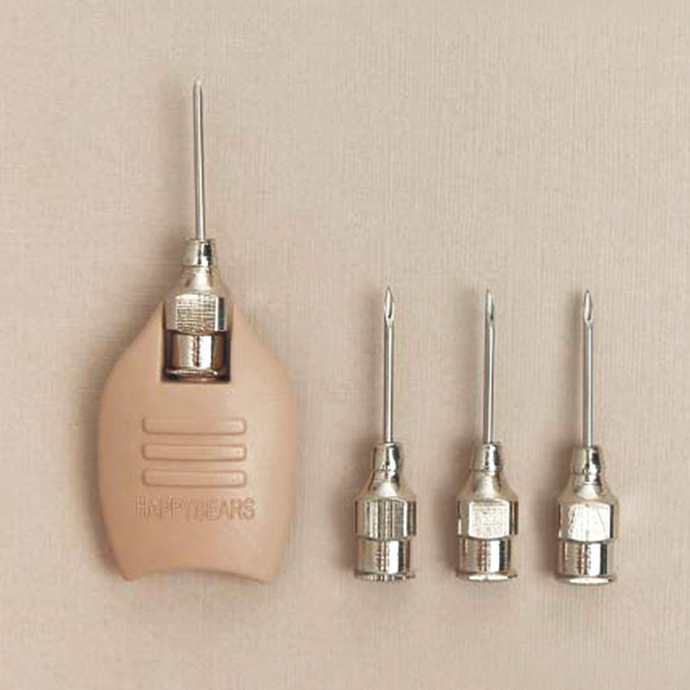 針を出したい位置の表からクイックニードルを刺し、クイックニードルの針の中に縫い針を刺込み表側方向にクイックニードルを引き抜き針を出す仕組み。