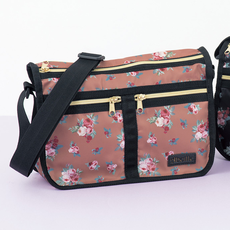 【完成品】全体にバラ柄を散らした軽量ショルダーバッグ。メイン・サブ・前後3つ、計5つのファスナーつきスペースに分けて収納できます。