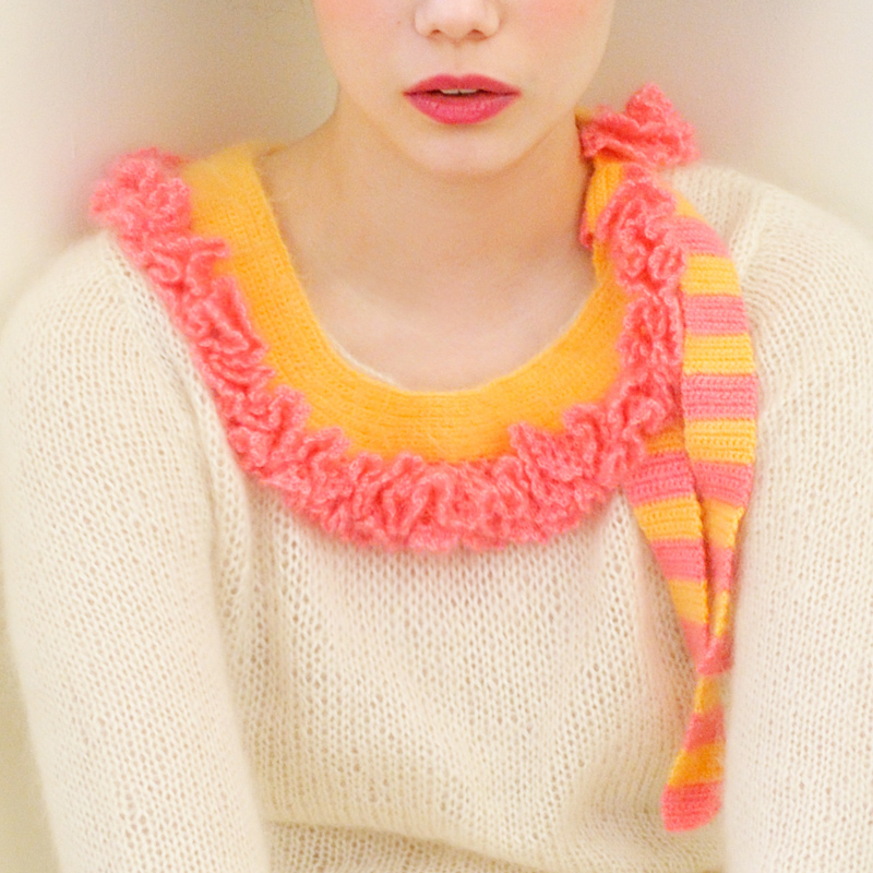 ピーチピンクとオレンジの大胆な組み合わせも衿部分だけなので、アクセサリー感覚で遊べます。分量の多いフリルもリボン代わりのひものシマシマも、キュート。結び方や結び目の位置をどこにするか、鏡の前で研究の余地あり。