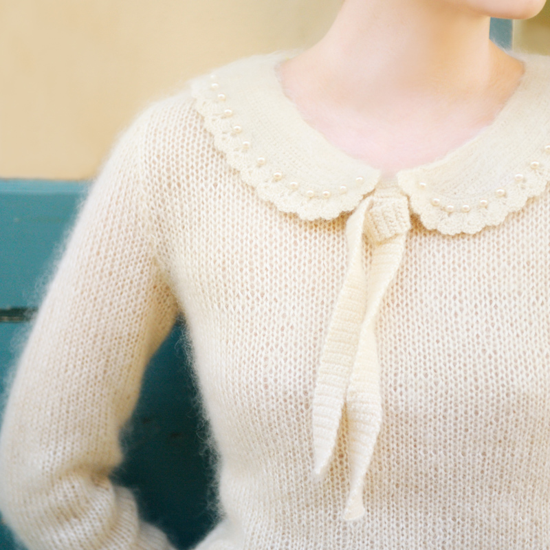 編みおわってから表面を起毛させた衿は、綿菓子のようなモヘアならではのテクスチャーに。等間隔でつけたパールビーズが可憐。