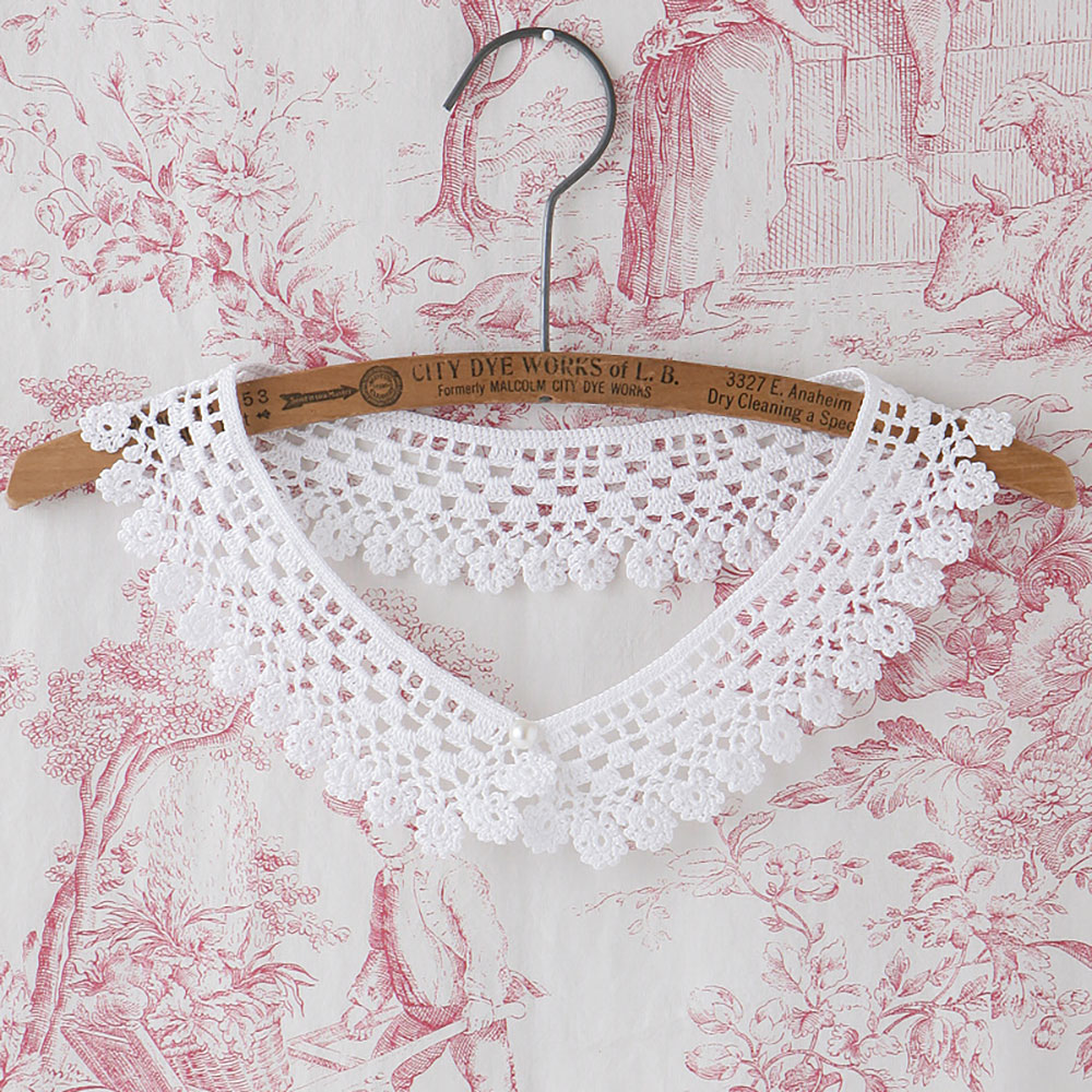 ベースは方眼編み、縁編みはドロップタイプの小さな花モチーフ。シンプルなテクニックでガーリーなつけ衿ができあがります。