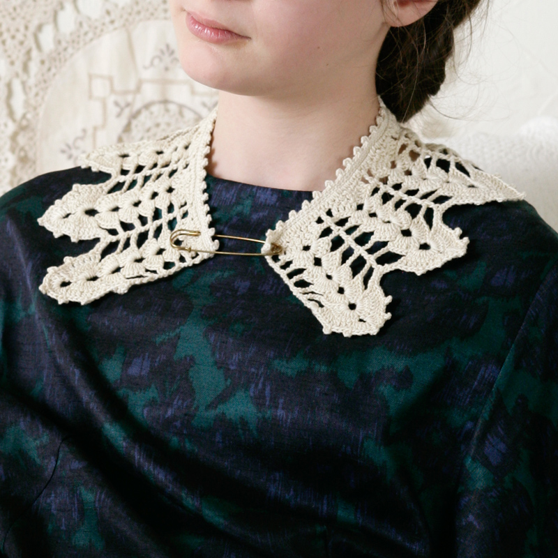 最終段と衿つけ側の縁編みピコットでアクセントをつけた飾り衿。左右に広がるようにシェル模様を編んで、シャープ感を出しました。