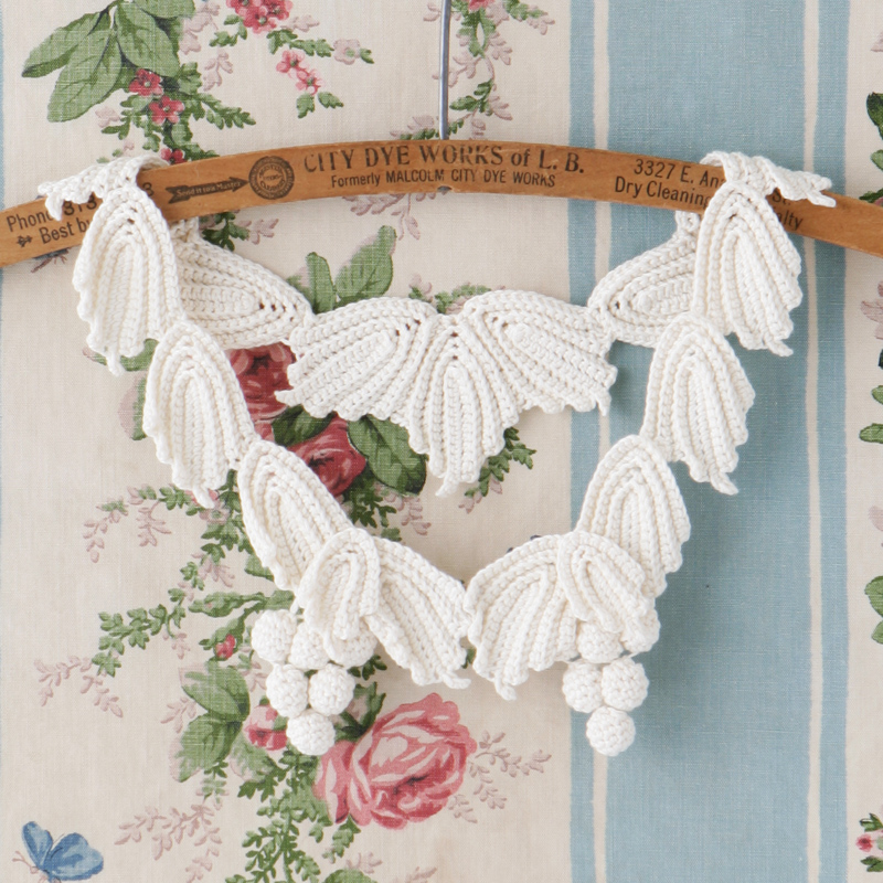 葉っぱの陰影とぶどうの丸みが立体感をかもし出した大人かわいい衿飾り。葉っぱはうね編み、ぶどうの房は編み玉をつなげて。