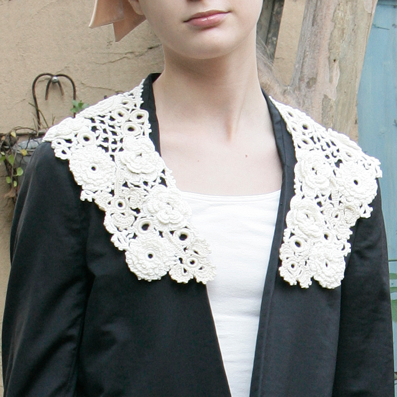 アイリッシュクロッシェの代表的なバラとシャムロックのクラシックなつけ衿。鎖とネット編みでモチーフをつなげていきます。