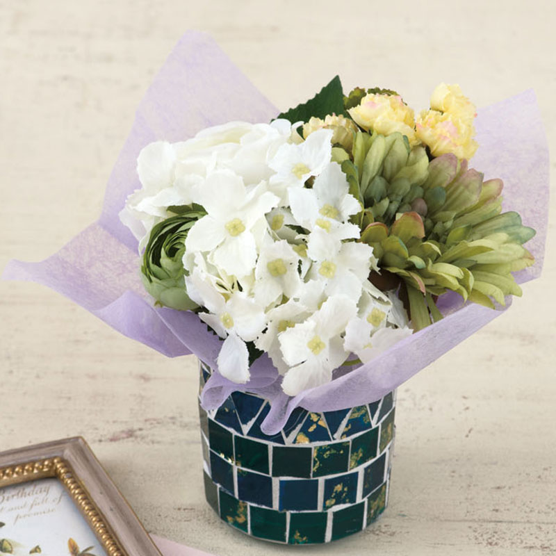 ●完成品●CT触媒(電荷移動型酸化還元)加工がされた、環境、人体、ペットにも安全な、造花ブーケ。モザイクのようなタンブラー型の花器入りで、すぐに飾ることができます。防汚、抗菌、消臭効果があり、置いておくだけで空気をきれいに。ボックス入りなのでケースのまま飾ったり、プレゼントにも。