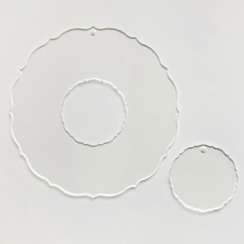 小ぶりなリースと、くり抜き部分を活用したチャームです。透明なアクリル素材は、窓辺など光のある場所に飾るのもおすすめ。