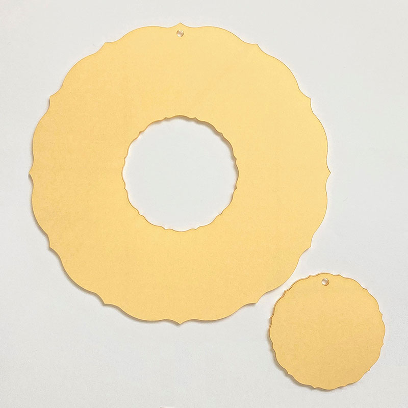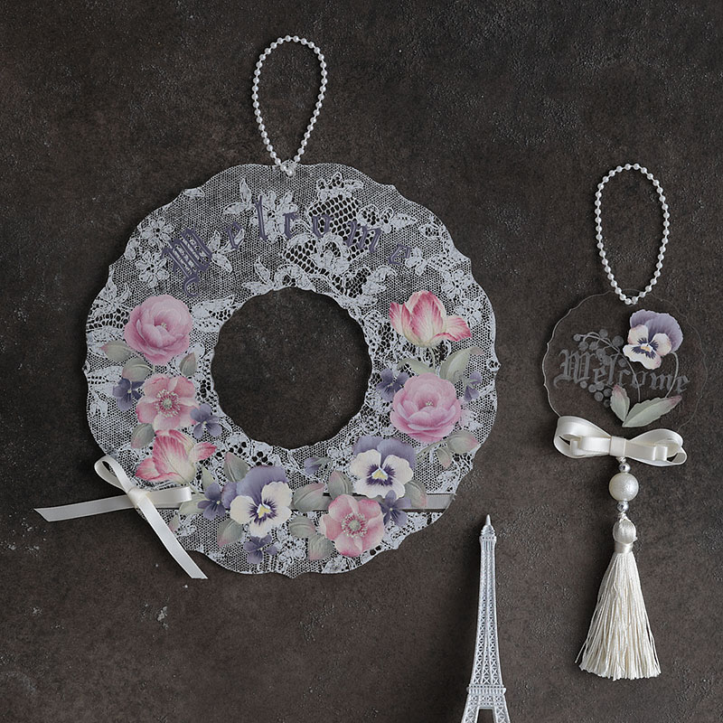 小ぶりなリースと、くり抜き部分を活用したチャームです。透明なアクリル素材は、窓辺など光のある場所に飾るのもおすすめ。