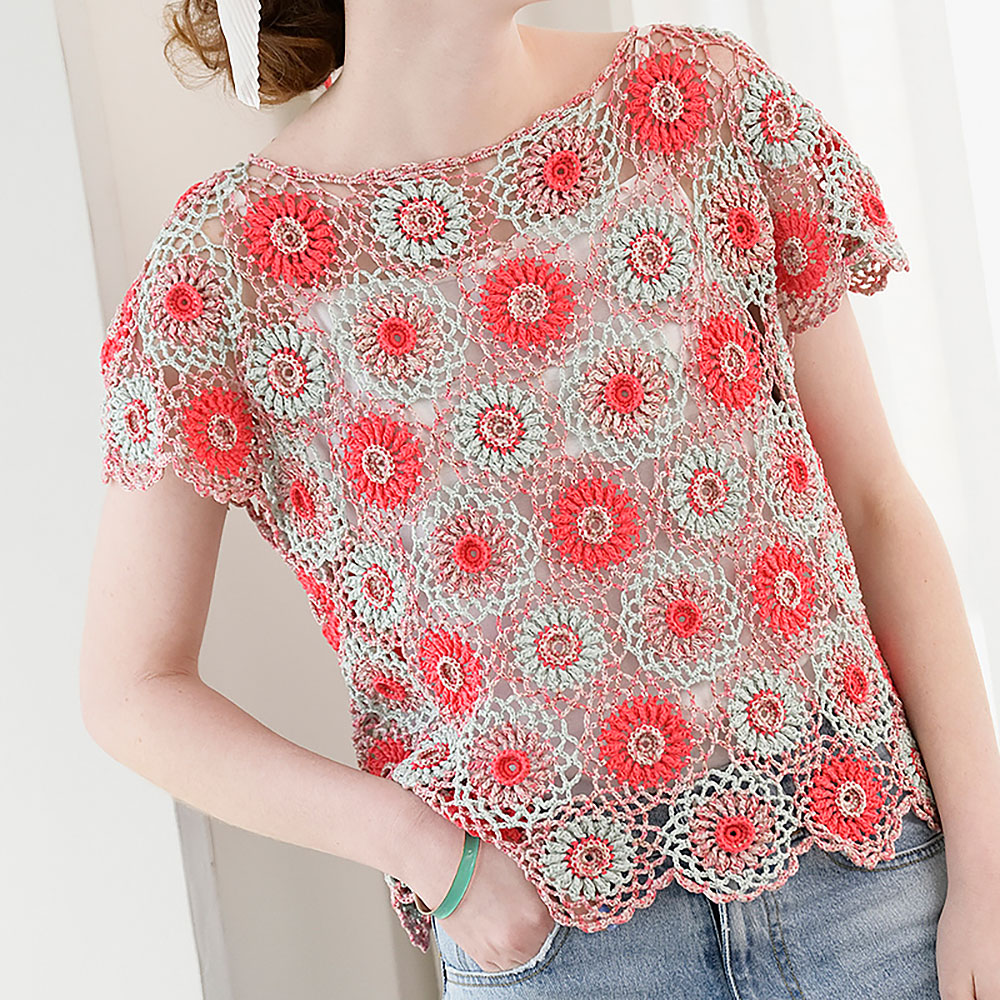 テープヤーンで編む円形の花モチーフは、平板にならないよう中心に立体感を持たせています。引き上げ編みを上手に使ってちょっと意外な編み方をした、実はテクニカルなモチーフです。配色に段染め糸を混ぜて、何とも言えないニュアンスをプラス。