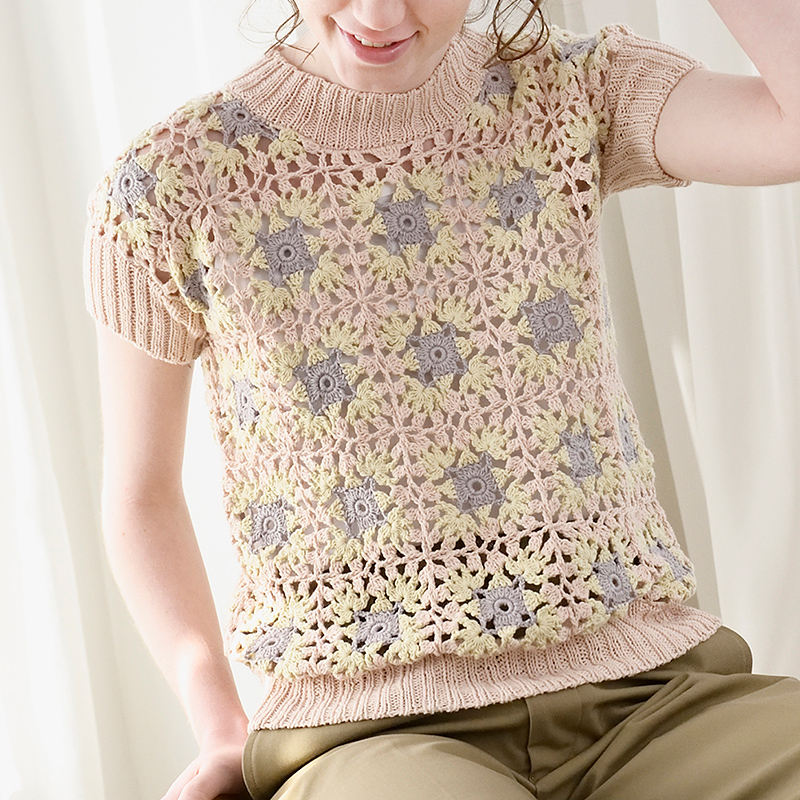 かぎ針と棒針ハイブリッドのプルオーバーは、SDGsに配慮したやさしい色合いのオーガニックコットンで編みました。編んでいない空間も模様を作る、ということを感じさせてくれるモチーフに、かぎ針編みの弱点を補う棒針づかいが秀逸です。