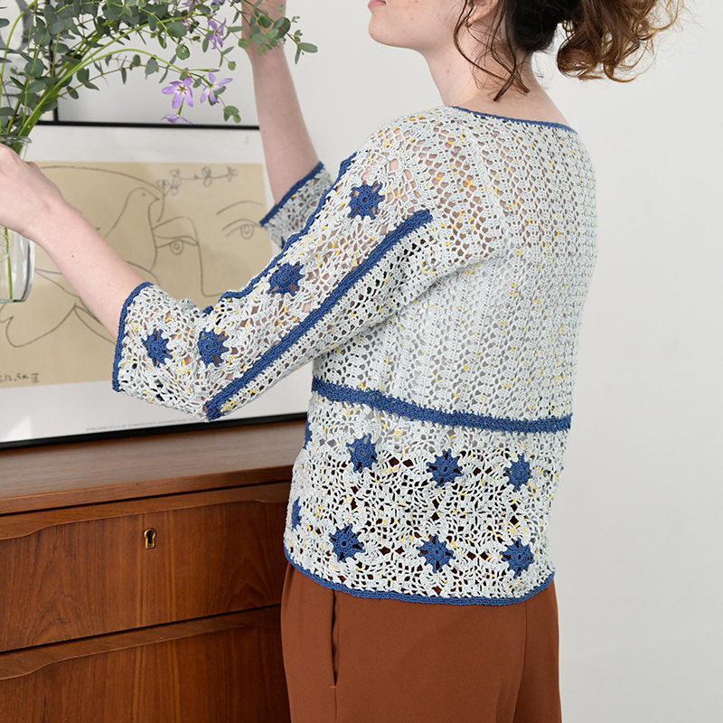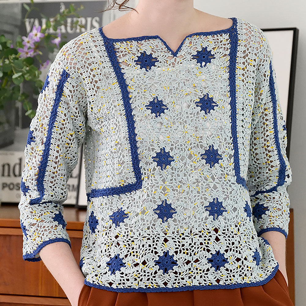 モチーフつなぎと地模様を組み合わせたプルオーバーは、ボレロを羽織ったように見える切り替えのラインが効いています。ミックスカラーの糸に混じる色がアクセントになってかわいい。凝った作りで、きれいめのおしゃれにもよく合います。