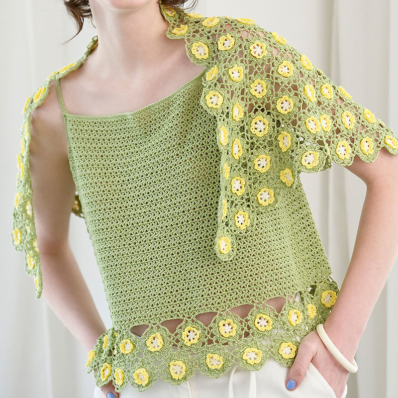 立体的なお花が可愛いモチーフつなぎのアンサンブル。きれいな若草色に白と黄色を散らして一面に並べたショールは春のお花畑のようです。 ※こちらのレシピはショールのみです。