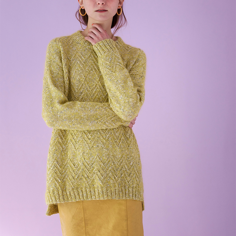 霞がかった花咲く野原色のチャーミングな編み地は、コットンリネンとシルクモヘアを3本どりにして。チェーンステッチのようにも見えるすべり目のジグザグ模様が、 軽やかに並びます。まだ少し寒い日も春気分で着られるプルオーバーです。