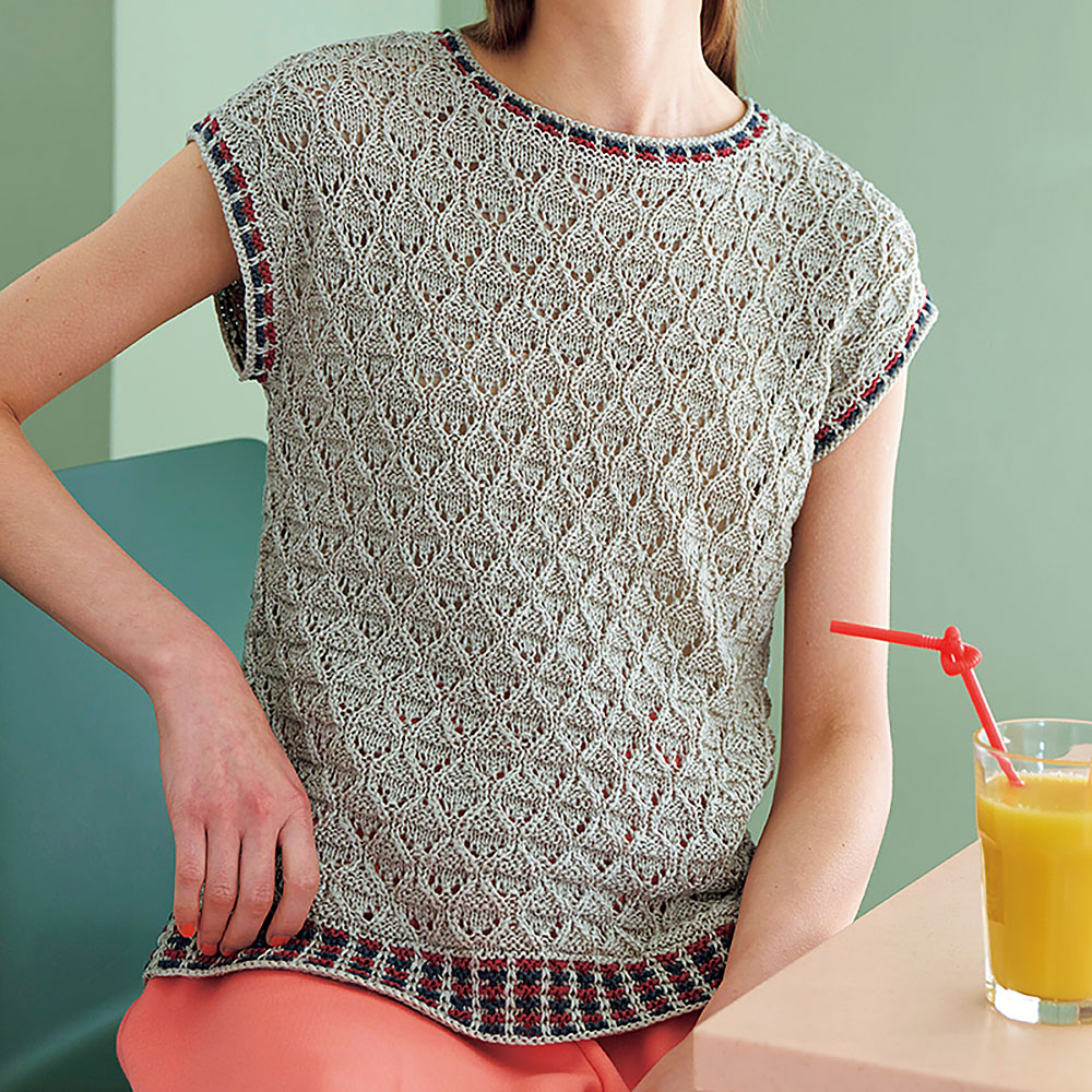 春先らしい透け感と大人のトリコロールカラーが魅力のフレンチスリーブのプルオーバーに、台形ショールをセットして。ちょっとしたお揃い小物が楽しめるのは、手編みの醍醐味。気温に合わせて調節できて、何かと便利に使えます。※こちらはプルオーバーのみのレシピです。
