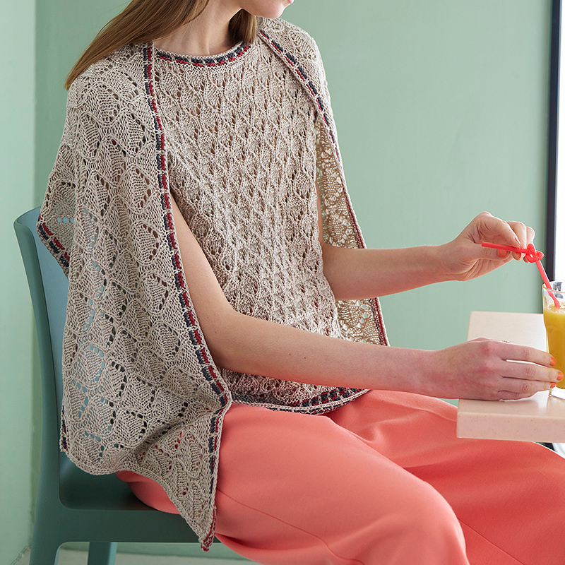 春先らしい透け感と大人のトリコロールカラーが魅力のフレンチスリーブのプルオーバーに、台形ショールをセットして。ちょっとしたお揃い小物が楽しめるのは、手編みの醍醐味。気温に合わせて調節できて、何かと便利に使えます。※こちらのレシピはショールのみです。