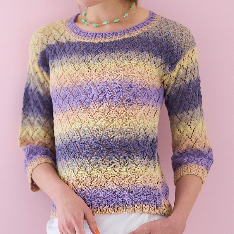 ダイヤの透かし模様のプルオーバーは、衿ぐり以外はまっすぐに編むスマートなデザインが嬉しい。春の夕暮れの地平線のように境界線が溶け合うカラーリングが美しく、編み進むのが楽しくなる糸です。