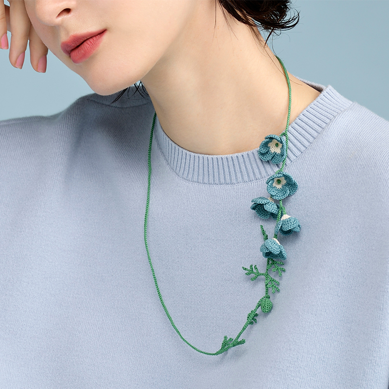 ブルーと白のコントラストが爽やかで愛らしい、人気のネモフィラをネックレスに仕立てました。留めの部分になるつぼみから編み始め、茎の部分とギザギザと切れ込んだ形状も絵になる葉は、ひと筆書きのように続けて編み進めていきます。