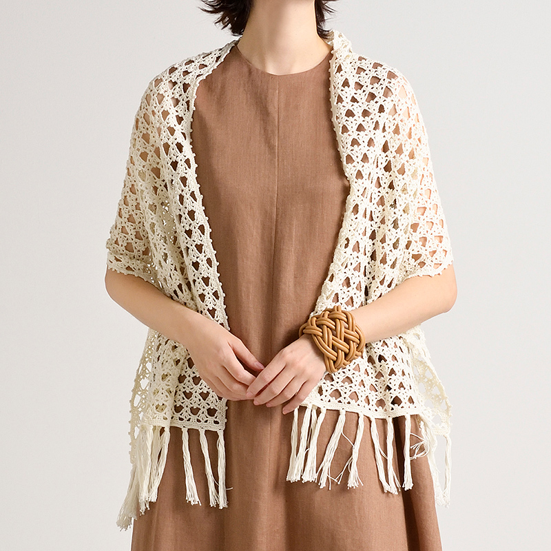 どんな服と合わせても、しっくりとなじむ生なり色のショールは、使いやすい幅広タイプ。肩にかけるだけで、いつもの服をパッと華やかにしてくれます。顔色をきれいに見せてくれる、レフ板効果にも期待!