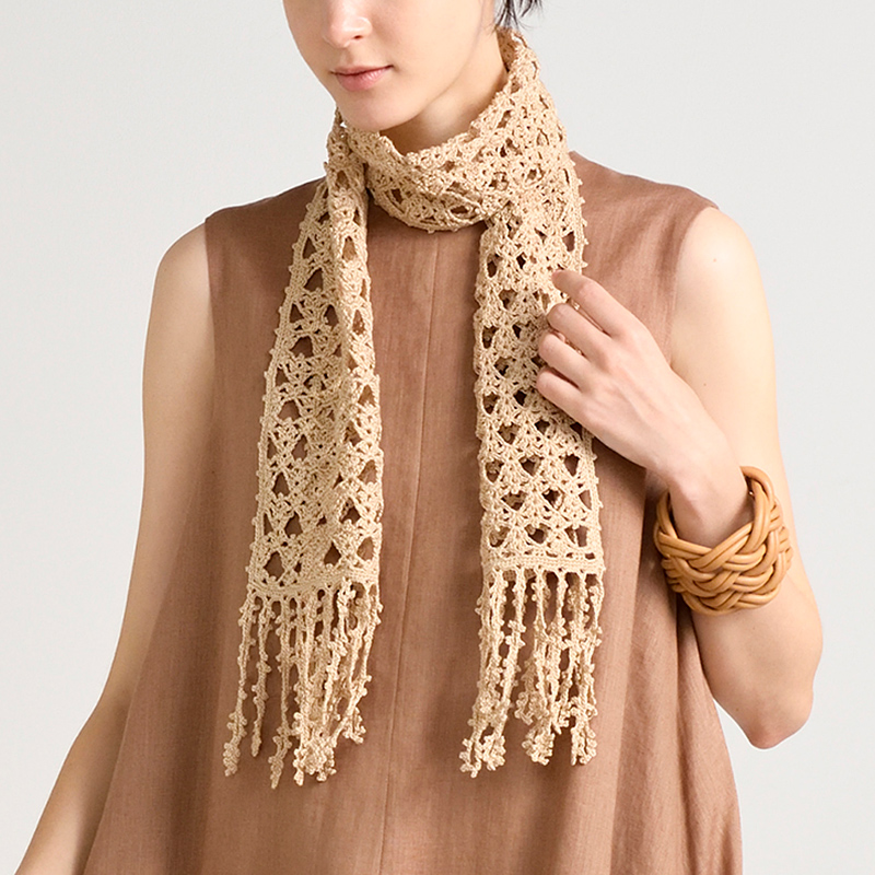 ネイビータイプは、幅広ショールの半分の幅ですっきりと仕上げました。 濃色のショールは、膨張して見える春色服をキリリと引き締めるポイントにもなるアイテム。縁編みの鎖の輪に、フリンジを通しています。