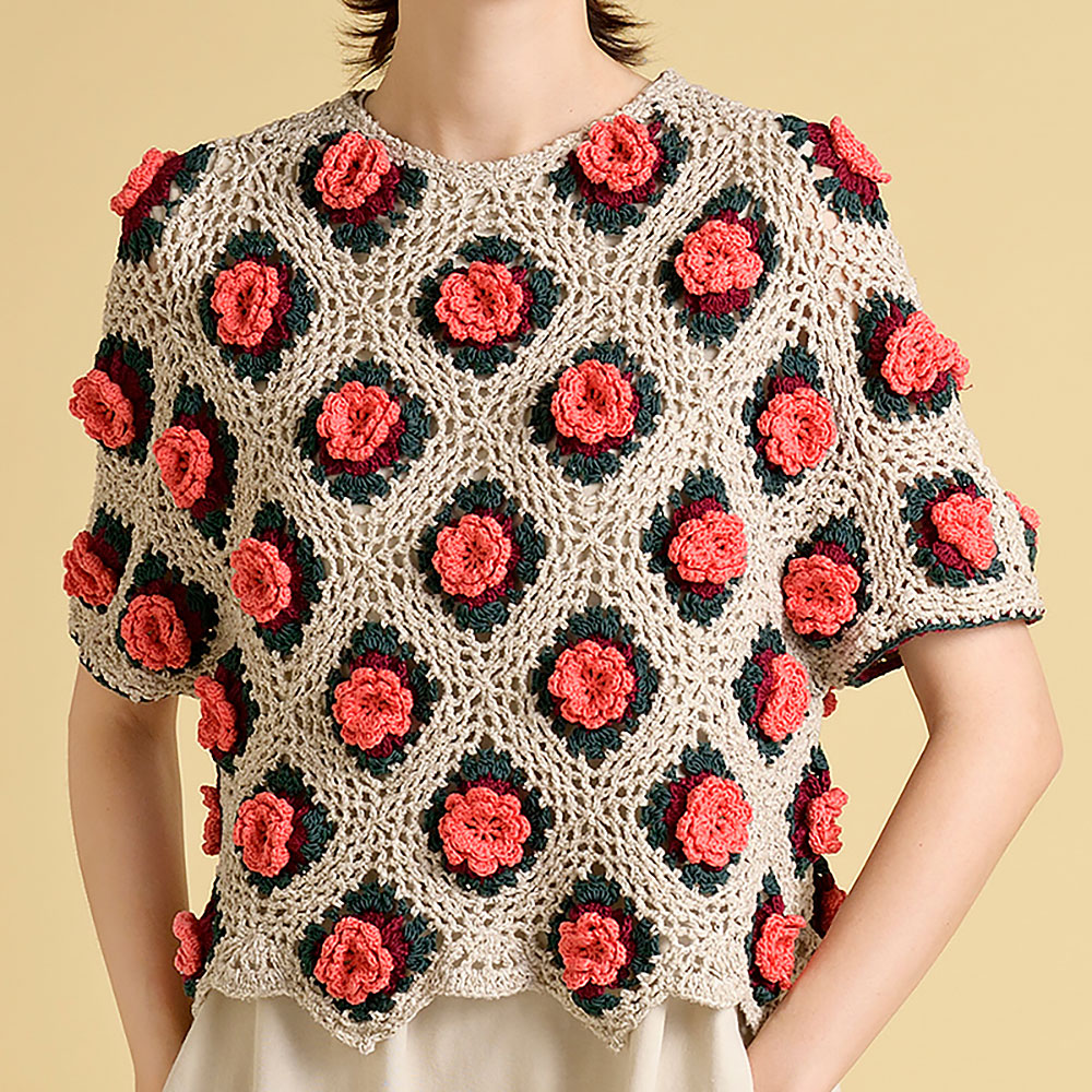ボリューム感のある立体的なバラでインパクトのあるプルオーバーです。手編みならではのクラフト感も魅力。