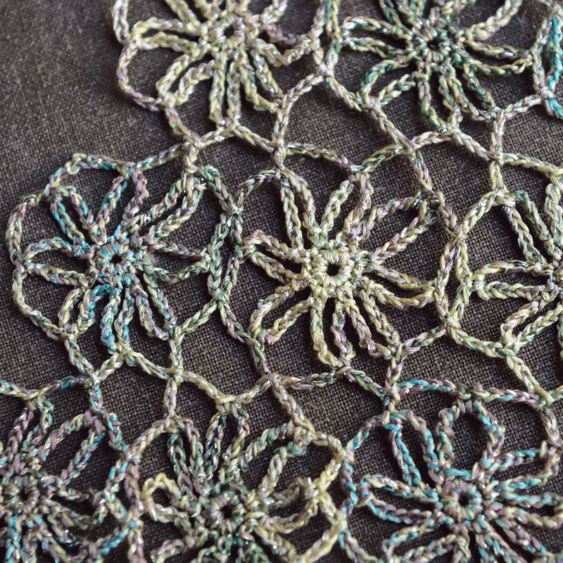 シンプルな鎖編みのモチーフをきらりと光る糸で編んだショールはアクササリーのように身に着けて。