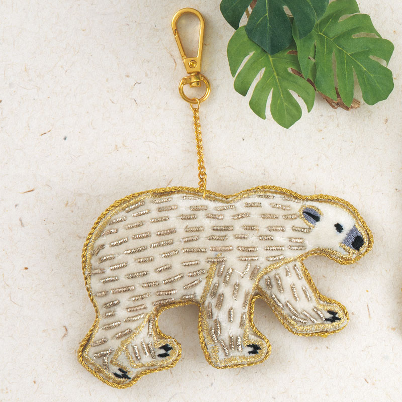 【完成品】インド伝統の“ザリ刺繍”のアニマル型キーホルダーです。金や銀のコイル状のモール糸を、フックのような針を使って手作業で縫いつけています。