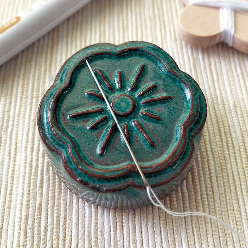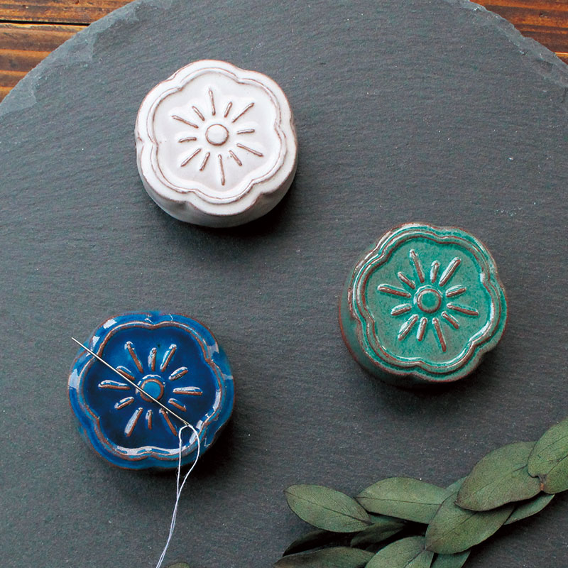 【完成品】日本でも有数の瓦産地、兵庫県淡路島の「淡路瓦」を、心和む花モチーフの針道具に。釉薬の色によって焼き上がりの表情が異なるため、同じ物がふたつとありません。