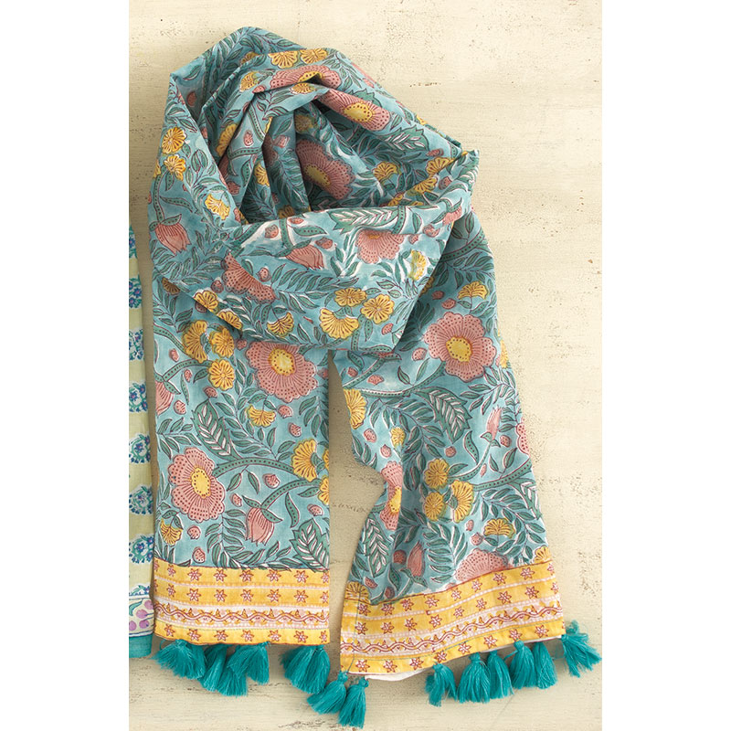 【限定50】【完成品】スカーフとして、またテーブルランナーやカバーなどのインテリアファブリックとしても活躍するクロスです。職人の手仕事による、他にひとつとして同じ出方のない柄が魅力。両端の小さなタッセルがポイントに。