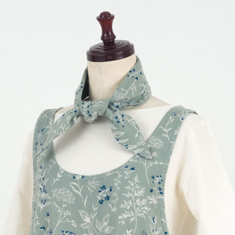 【限定50】【完成品】お揃いでも使える、素敵な草花柄のアイテム2種。裏のポケットに保冷剤を入れられるネックスカーフと、ちょっとした外出もOKのワンピース型エプロンです。