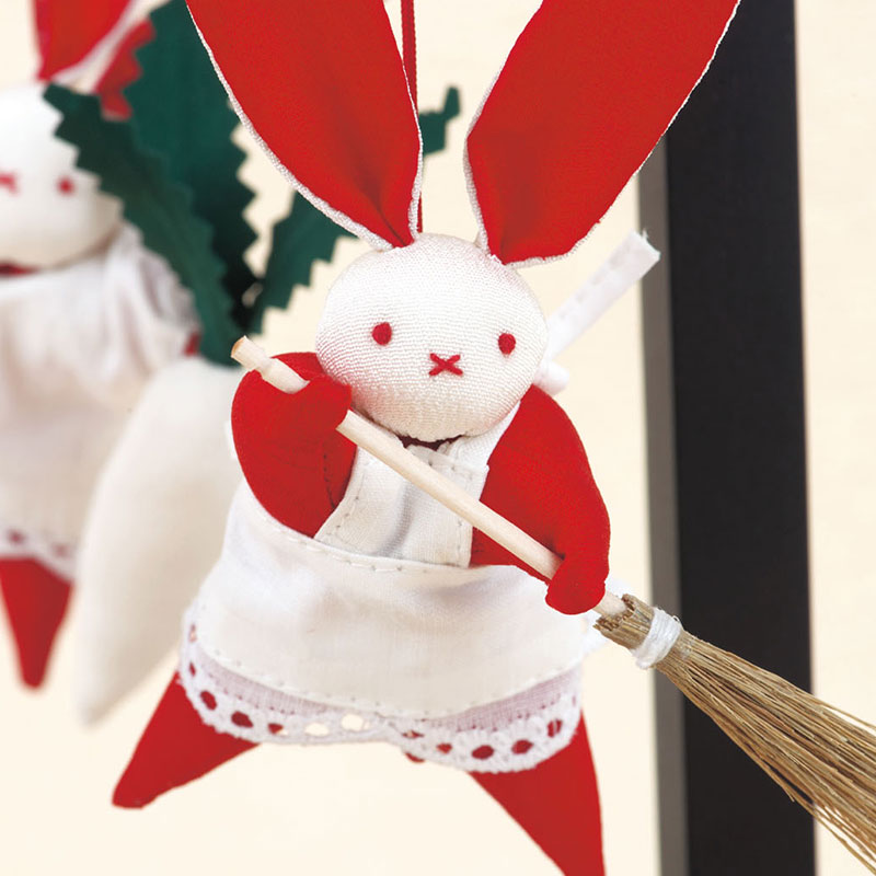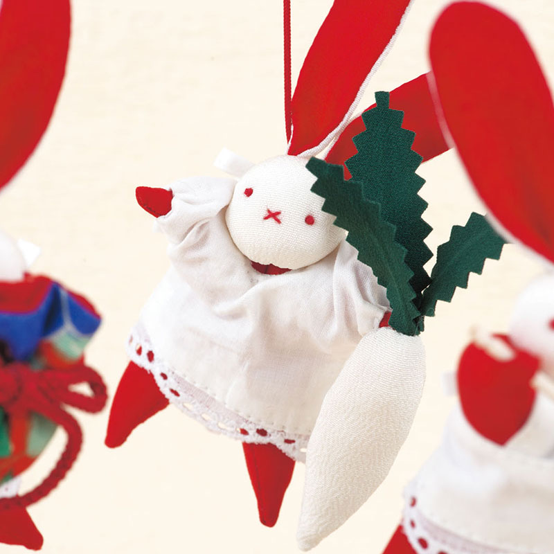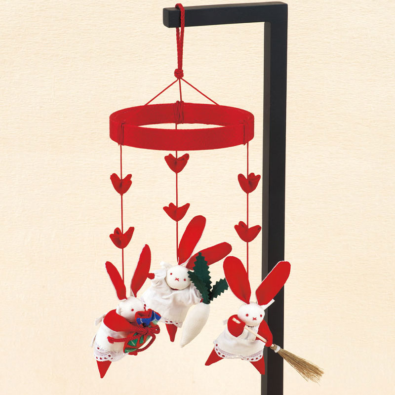 【古裂】【キット作り方つき】エプロン姿の3羽のウサギが、それぞれほうき・ダイコン・巾着を持った愛らしいつるし飾りです。女の子のお節句用にも。