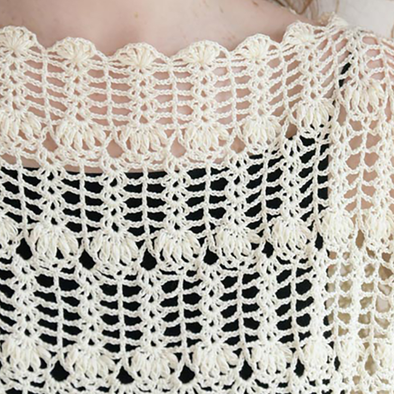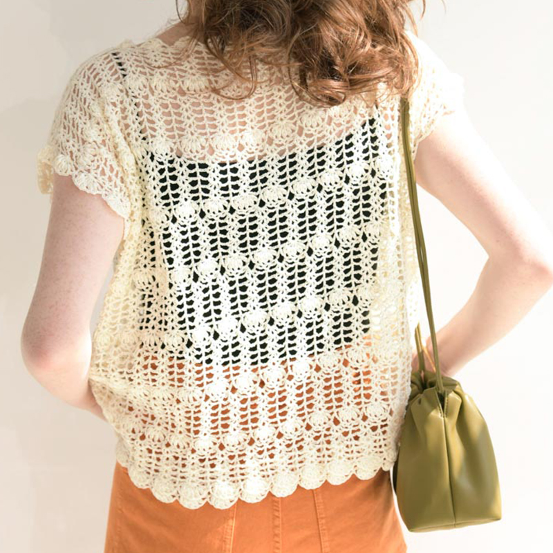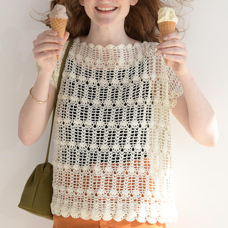 模様をずらして交互に配置することで、シンプルな模様でもちょっと凝って見えます。ゆったりと四角く編んで、着ると自然にフレンチスリーブになるやさしいパターンなので、初めてのレーシーウエアにもぴったり。衿あきと袖口にはあとからスカラップを編みつけます。