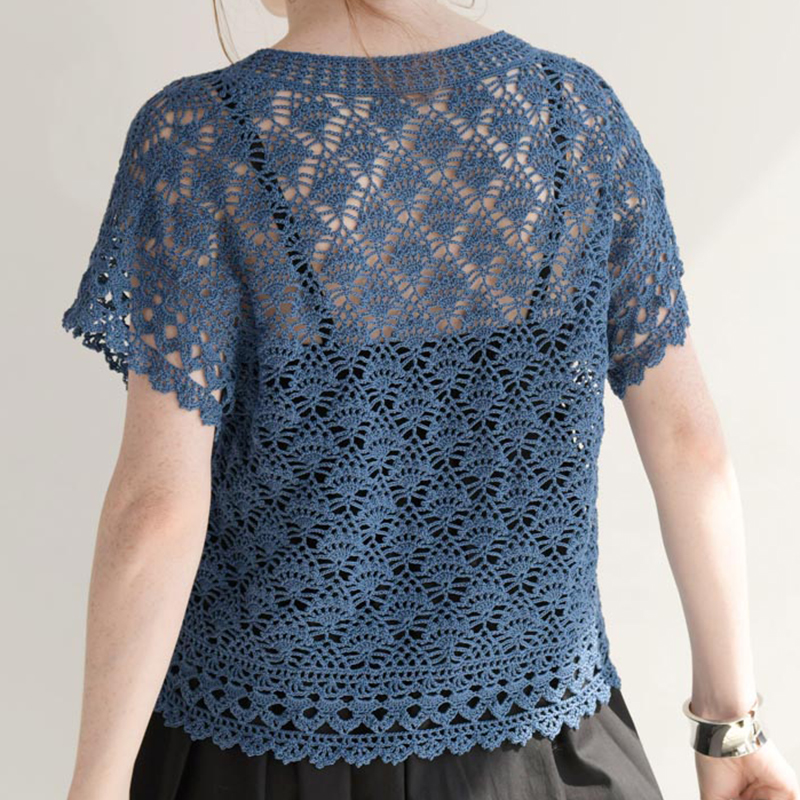 小さなパイナップル模様を一面に並べたゴージャスな模様を、ネイビーでシックに編み上げて。クロッシェレースらしい品の良いボレロカーディガンですが、太めの前立てがエレガントさを抑えてくれるのでカジュアルスタイルに合わせるのもおすすめ。