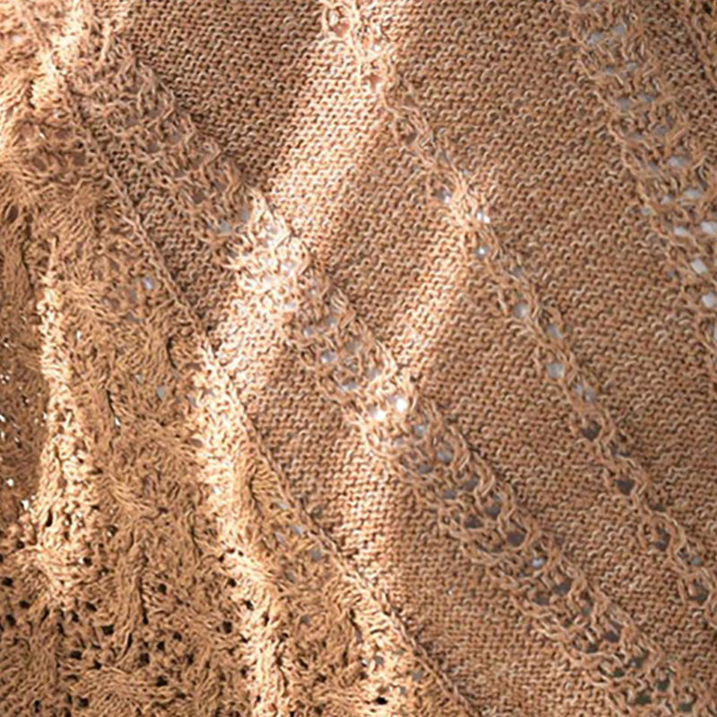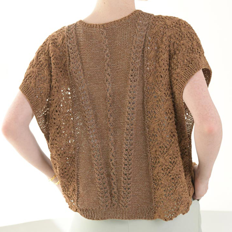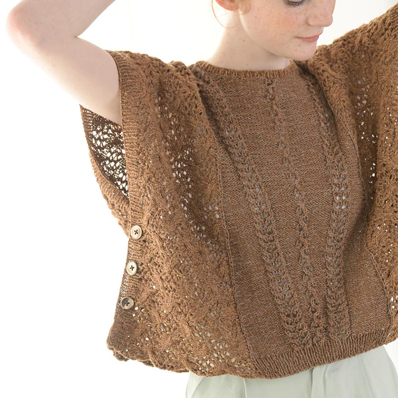 センターパネルに入れた透かし模様のV字ラインが目を惹く、ポンチョタイプのプルオーバー。サイドのパーツはセンターパネルから目を拾って横に編みます。センターとサイドは、茶色のシルクヤーンに引き揃える細いリネン糸の色を変え、ニュアンスのあるバイカラーに。吹き抜ける風が心地良いニットです。