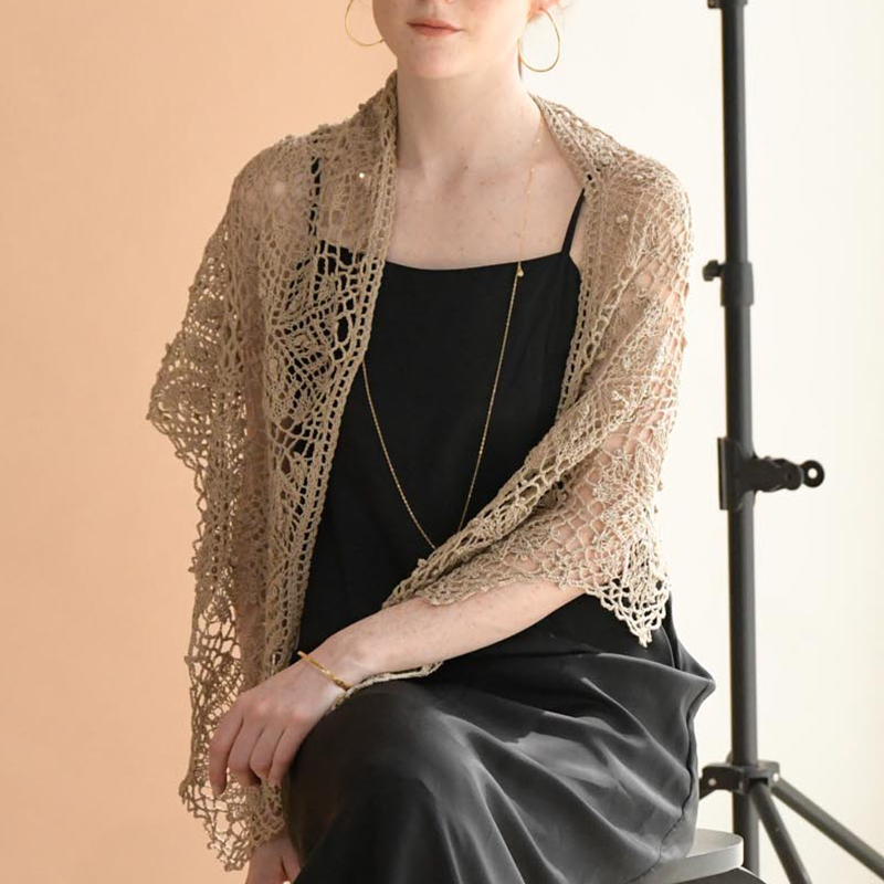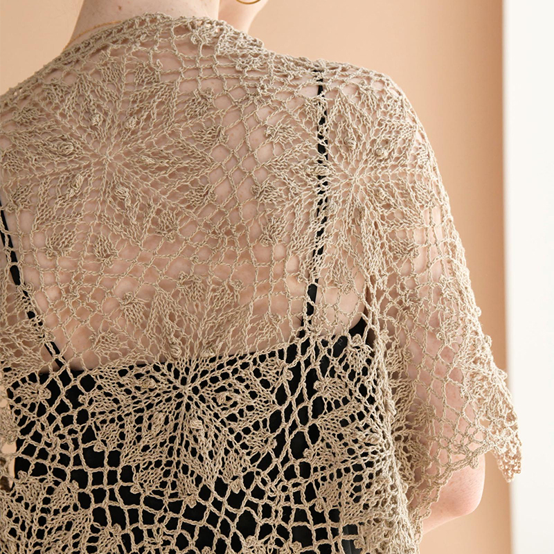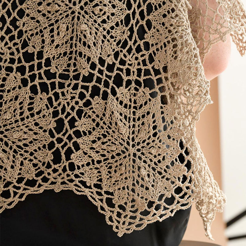 落ち着いたアースカラーが目を引くクンストレースのモチーフを、かぎ針でモチーフつなぎにしたハイブリッドなショールです。中心から編む棒針編みの花モチーフと、かぎ針編みのネットが違和感なく混ざり合った新鮮なニュアンスに惹かれます。