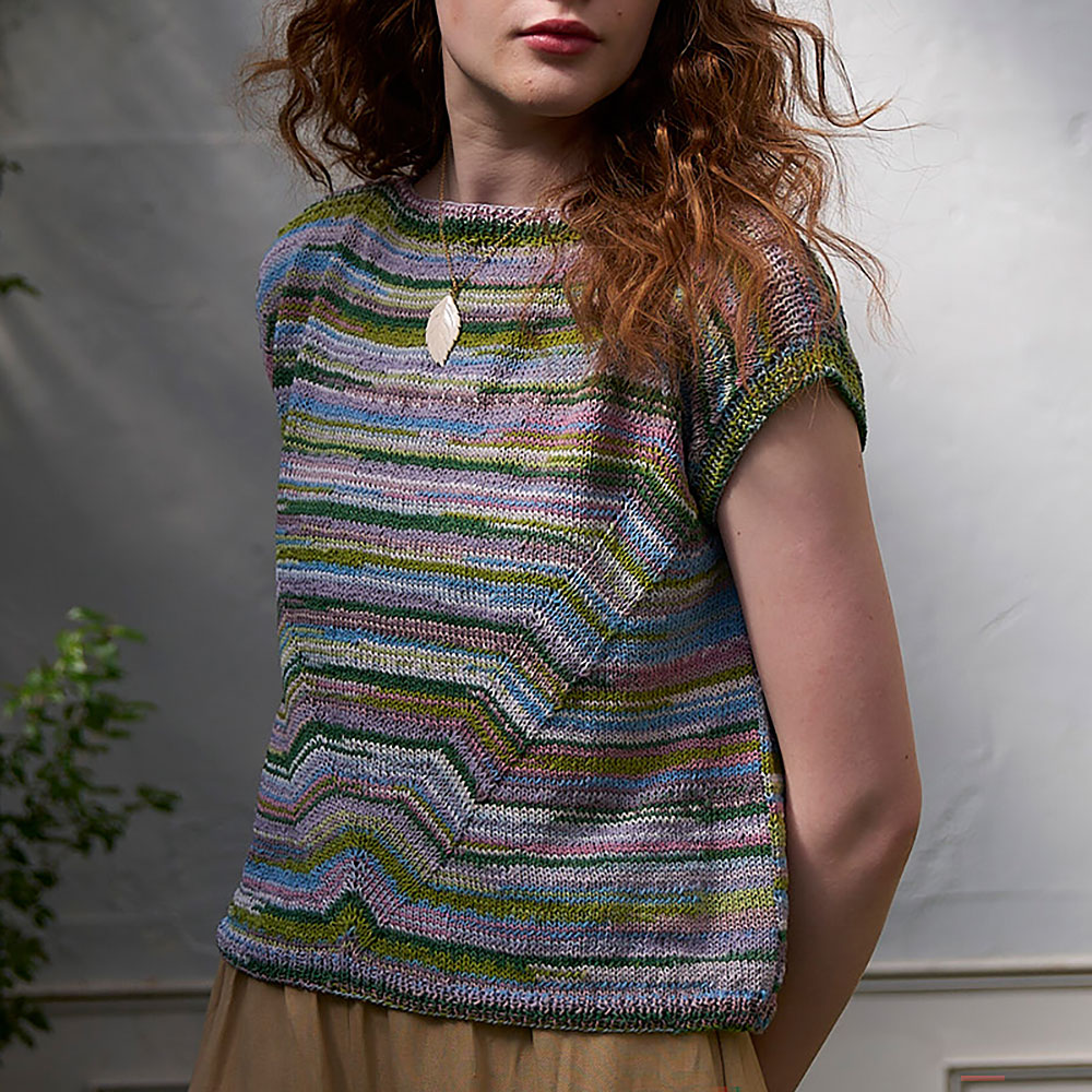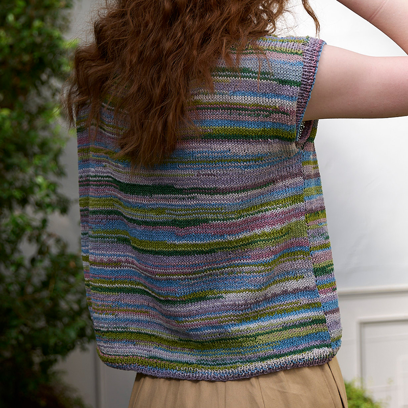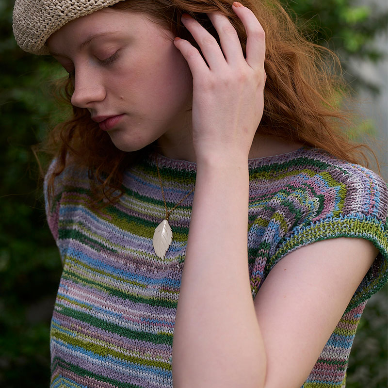 編むだけでマルチカラーの配色が楽しめる段染め糸に、かけ目と2目一度で大きなV字ラインをプラス。ゆらぎが快いアクセントになって、編みあがるのが楽しみに。ペーパー素材の細編みベレー帽を合わせて、クールな夏スタイルの完成です。