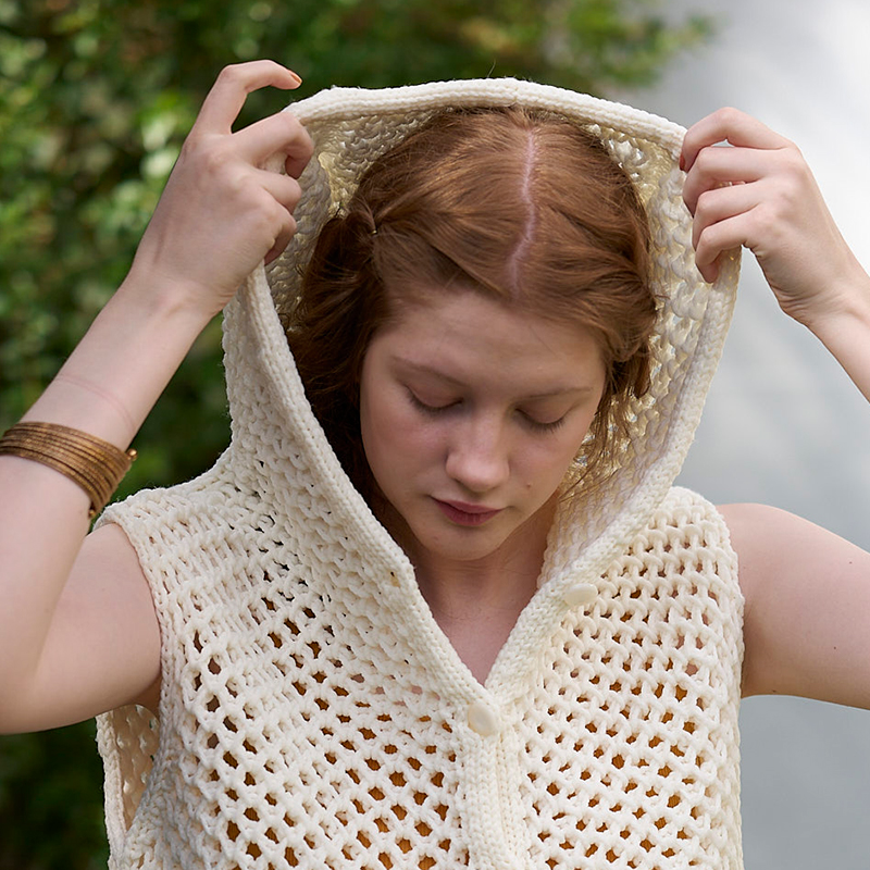 大きな穴あき模様のフーディーは、水に濡れてもOKな素材なので、水着の上から羽織っても大丈夫。海でも山でも映えること間違いなし!